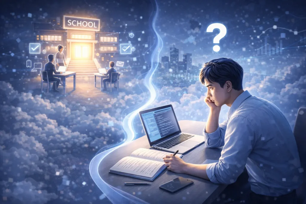 クラウドを勉強しようと思って調べ始めた瞬間、「スクールって必要?」「独学だと遠回り?」で手が止まる人、多いです。僕もクラウド 入門の最初、教材とサービス比較ばかりして、気づいたら1週間ほぼ進んでいませんでした。分からないのは意志の弱さじゃなくて、情報量が多すぎて“判断軸”がないだけなんですよね。結論から言うと、スクールが効く人/独学で十分な人は「期限・質問環境・自己管理」の条件で分かれます。この記事では、その判断基準を先に出したうえで、スクールに期待していいこと・期待しすぎ注意、そしてどちらを選んでも迷わないクラウド 基礎 勉強方法(概念→用語→サービス)まで整理します。読み終わる頃には「次にやることが1つ」に絞れるはずです。