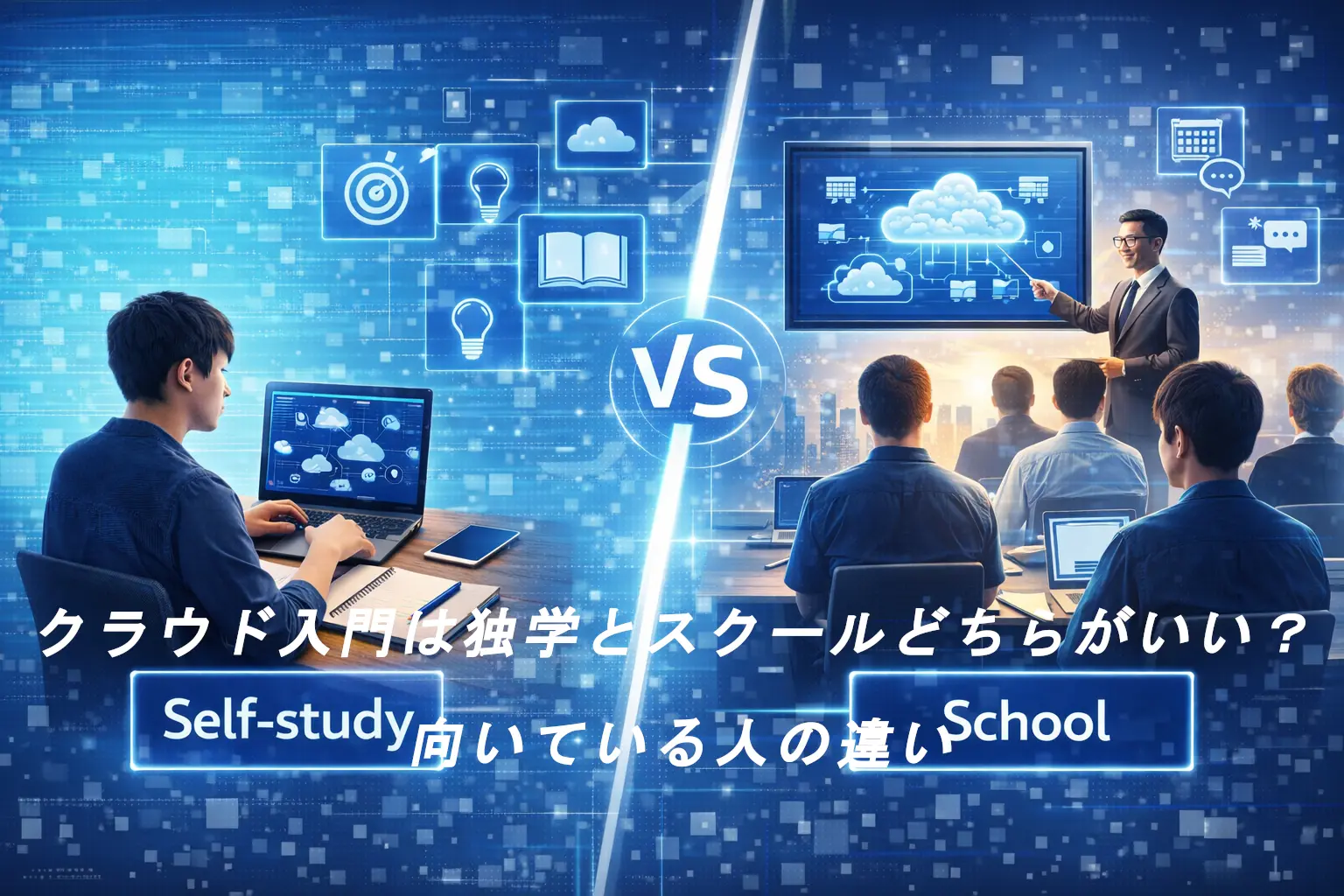 「クラウドをやりたい」と思って検索したのに、次に出てくる悩みがこれですよね。独学でいけるのか、それともスクールに頼るべきか。情報は多いのに、決め手がなくて手が止まる。僕も最初の頃、比較記事を読み漁っては「結局どっち…」と迷子になりました。結論から言うと、正解は1つじゃなく“条件”で決まります。この記事では、独学向き・スクール向きを判断できる軸を先に出し、独学なら「順番が9割」のクラウド 基礎 勉強方法まで落とし込みます。最後に、入門の到達ラインと次の一歩も整理します。クラウド 入門を遠回りせず進めたい人は、ここで一度、頭の中を整えてから走り出しましょう。