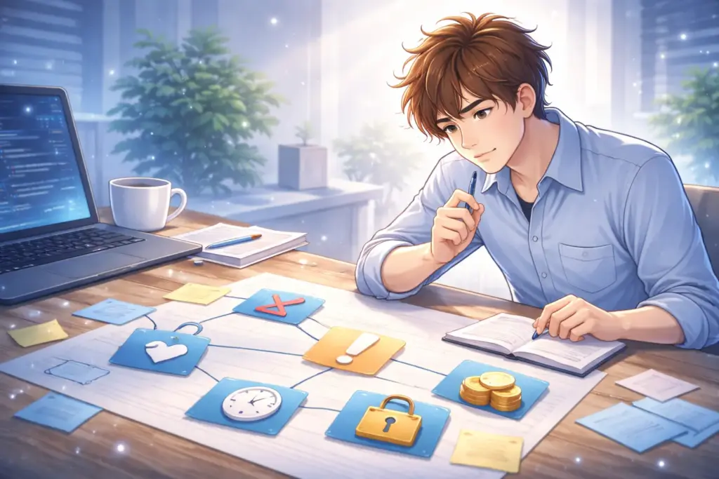 低収入で焦ると、頭の中が「転職する?」「もっと勉強?」で二択になりがちです。僕も当時、転職サイトを開いては不安が増え、動画教材を買っては積読。結局どちらも中途半端でした。けど本来は、選択肢の前に“判断軸”を持つべきなんですよね。軸があれば、迷いは減り、今やる準備が決まります。
