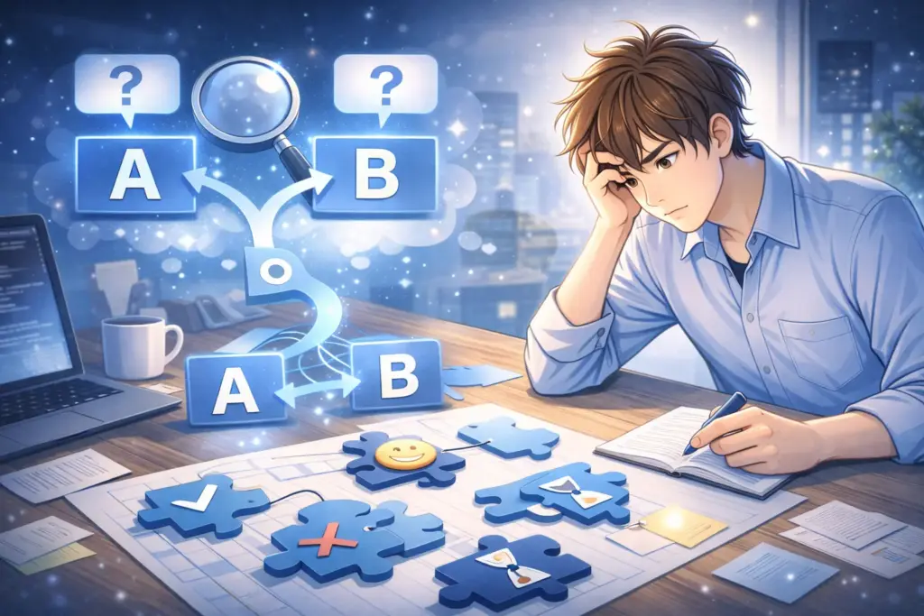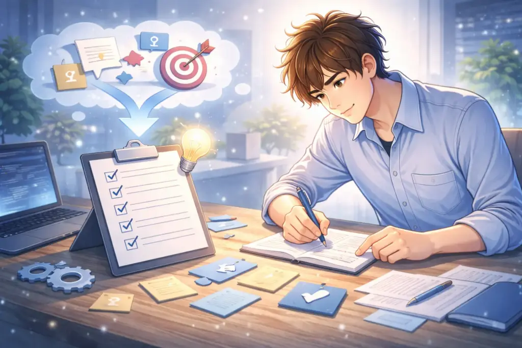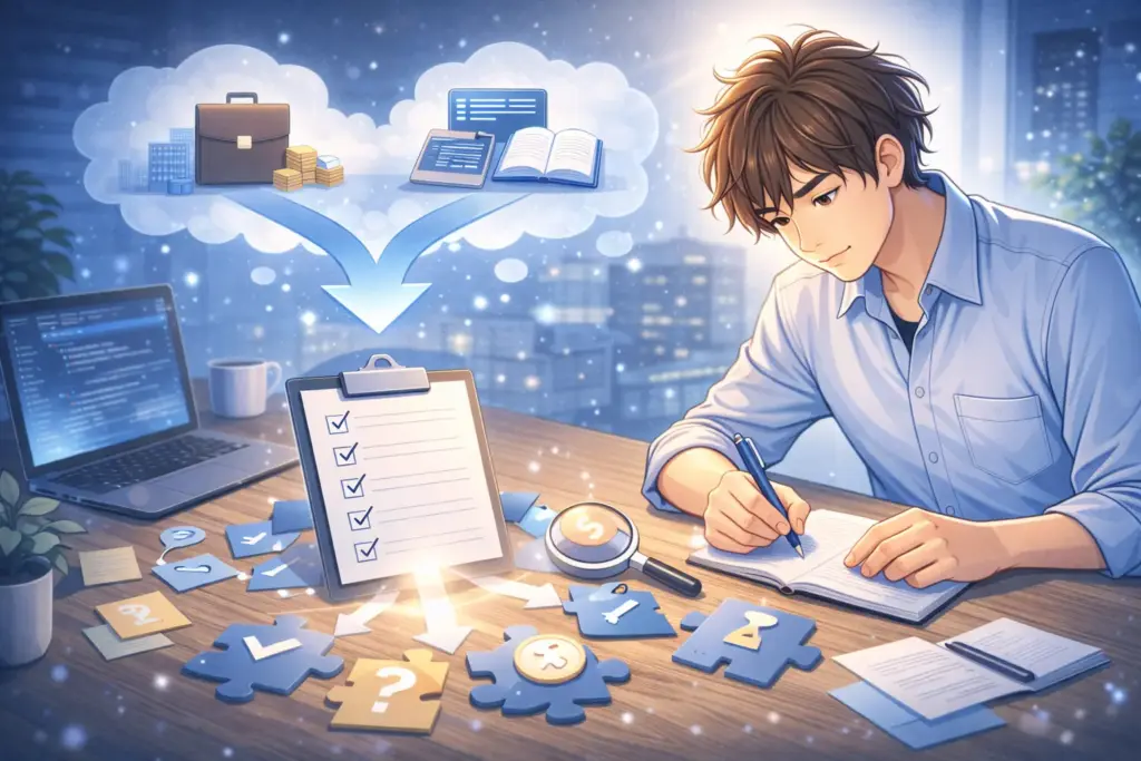 僕は目的ズレ×手段ズレの合わせ技でした。「何でもできる人が強い」と思い、Webもクラウドも触る。でも全部“入門止まり”。現場では同じ作業の繰り返しで、評価に出る材料が増えませんでした。基準ズレも痛かったです。「来月までに○○を任される」を決めず、ただ“なんとなく勉強”。これだと成果が見えず、さらに焦ります。ズレを直すだけで、選択肢は一気に絞れます。